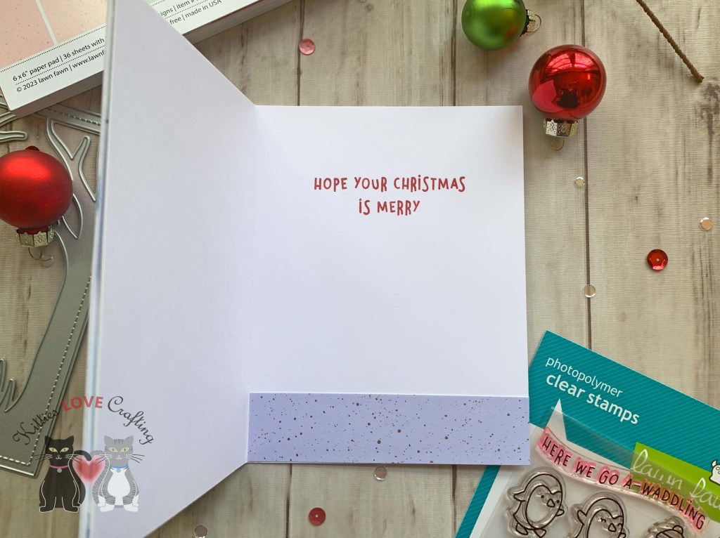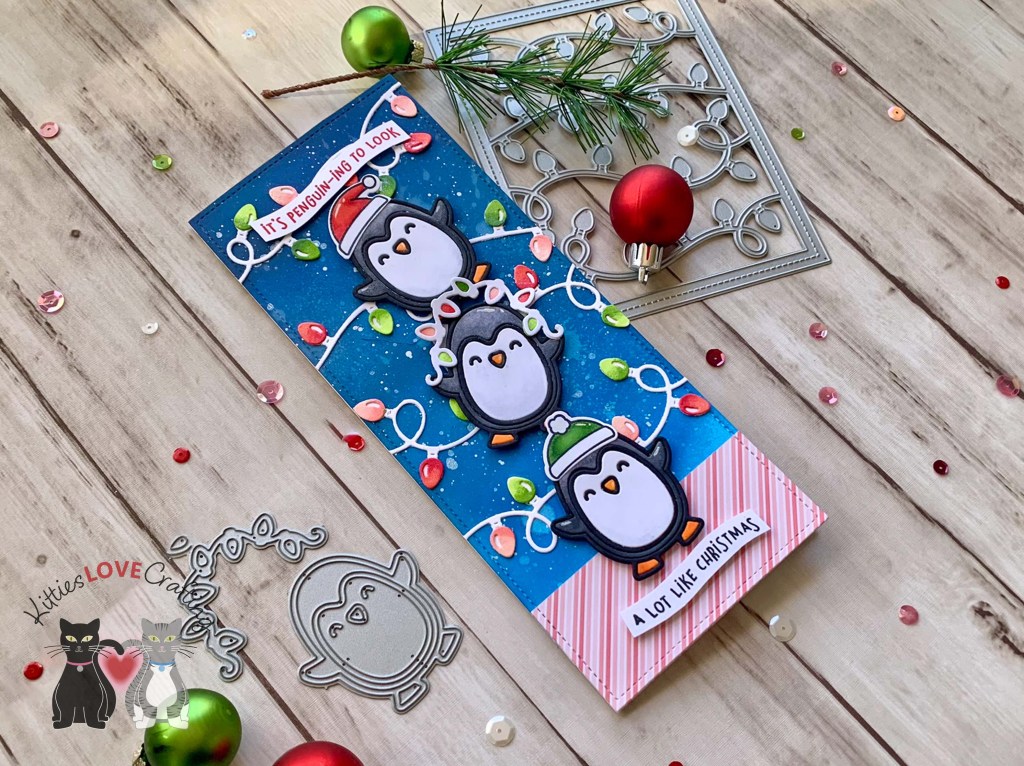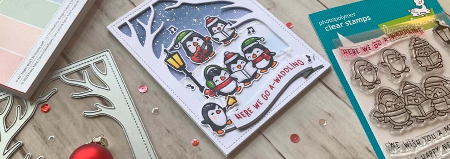 Hello friends. Here’s another card featuring these adorable penguins from the Lawn Fawn HERE WE GO A-WADDLING stamps. I paired it with an old die set from Catherine Pooler Designs. It was featured in the Winterhaven Stamp of Approval several years ago!