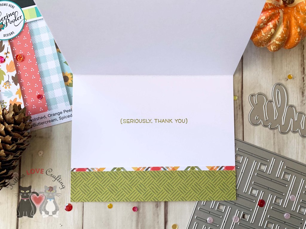 On the inside of the card, I cut a piece of Catherine Pooler Designs Sunflower Fields Forever 6 x 6 Patterned Paper to 1 x 4-1/4″ and stamped a sentiment from the Honey Bee Stamps Autumn Stampset (retired) with CP Spiced and Green Tea Inks and some more leaves.