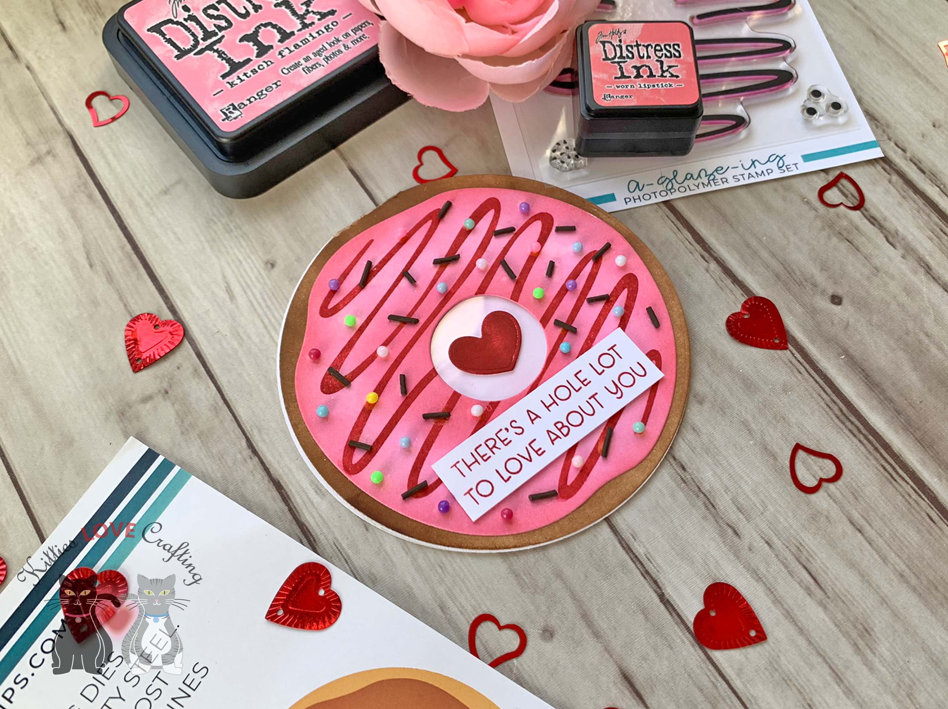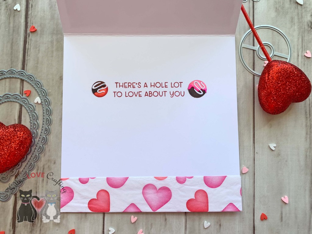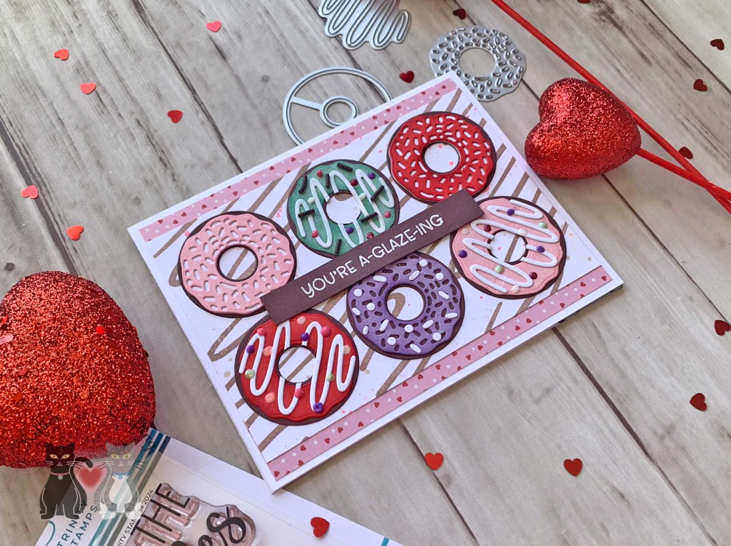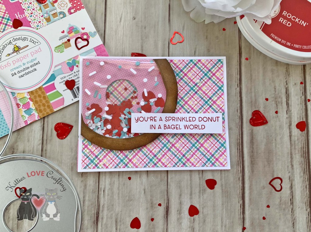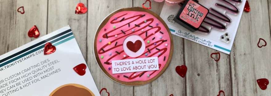 Hello friends. Here is another way to use the new Circle Shaped Card Die Set from Trinity Stamps to make a cute Valentine’s Day card — a flat shaker donut! I love making shaker cards but sometimes they can be bulky. This is a way to keep your card flatter so you can mail it without spending textra on postage. And who doesn’t want to save some money these days?!? Now my shaker pouch puffed a little bit but it’s still flatter than a traditional shaker pouch and I can remedy this next time by using a thinner plastic/acetate.