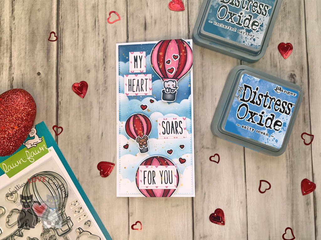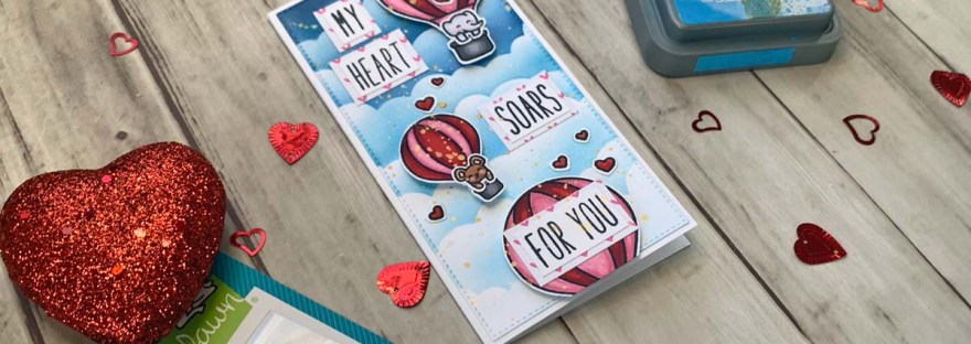 Hello friends. This card features the Lawn Fawn Fly High stampset. This is an example on how to create an interactive slimline card with this stampset. The hot air balloons can be used in a variety of ways. Check out the mini slimline Valentine’s Day card I made with it to see more ideas in my previous post.