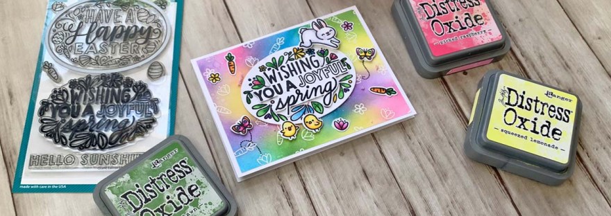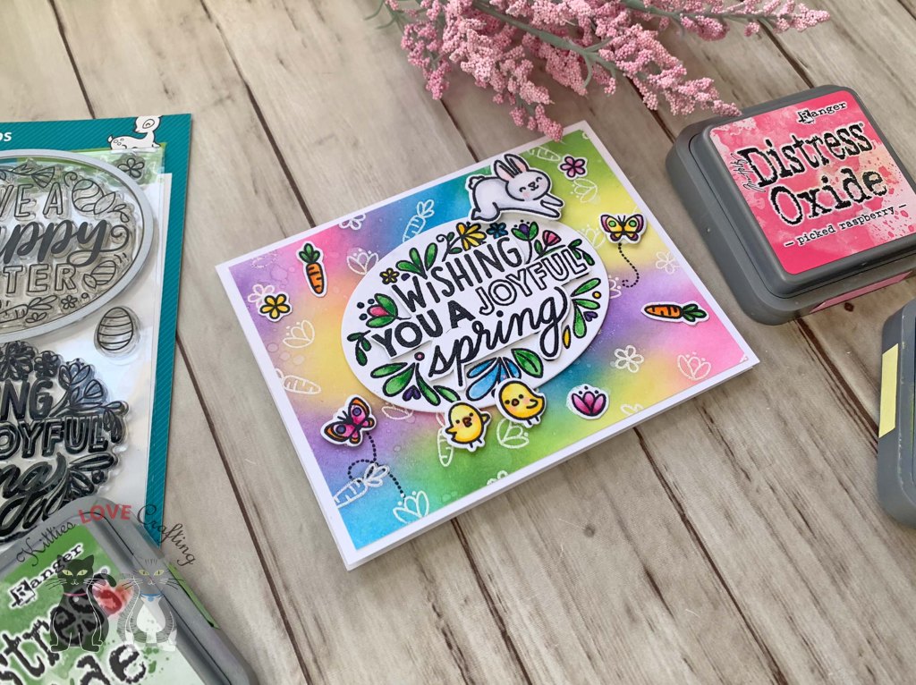Hello friends. Here’s another cute card featuring the Lawn Fawn Giant Easter Messages. For this one I created a bright background using the emboss resist technique with Distress Oxides. I also watercolored the center panel for a softer look.
