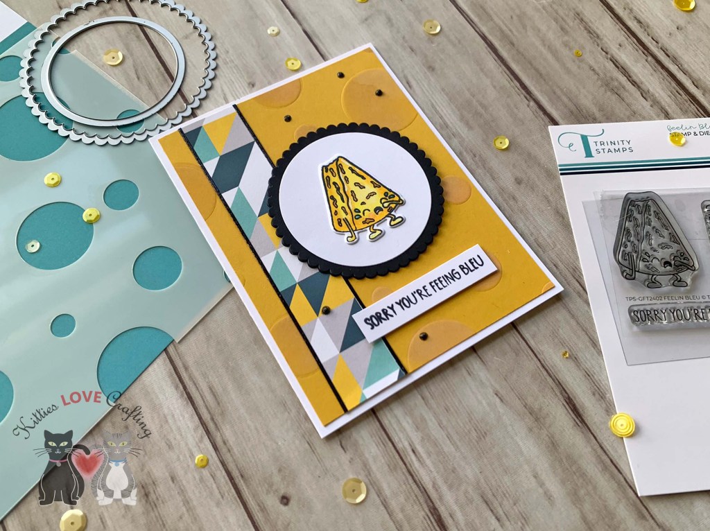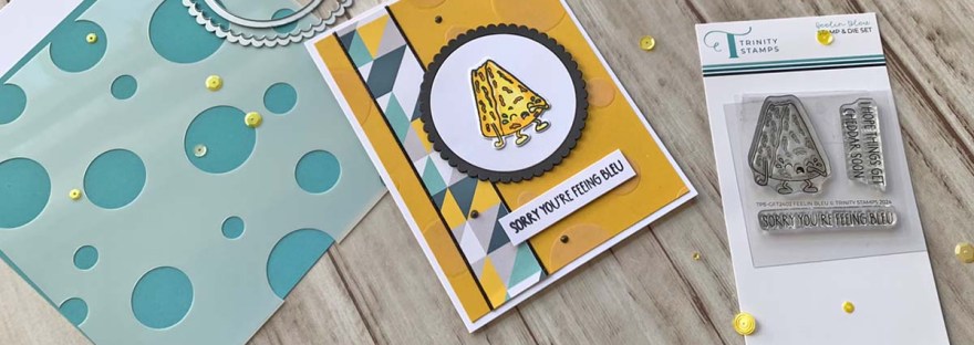 Hello friends. This mini stamp and die set, Feelin Bleu, from Trinity Stamps is just too cute! Had to make a card with it. This turned out to be a really quick card to make. Love that!