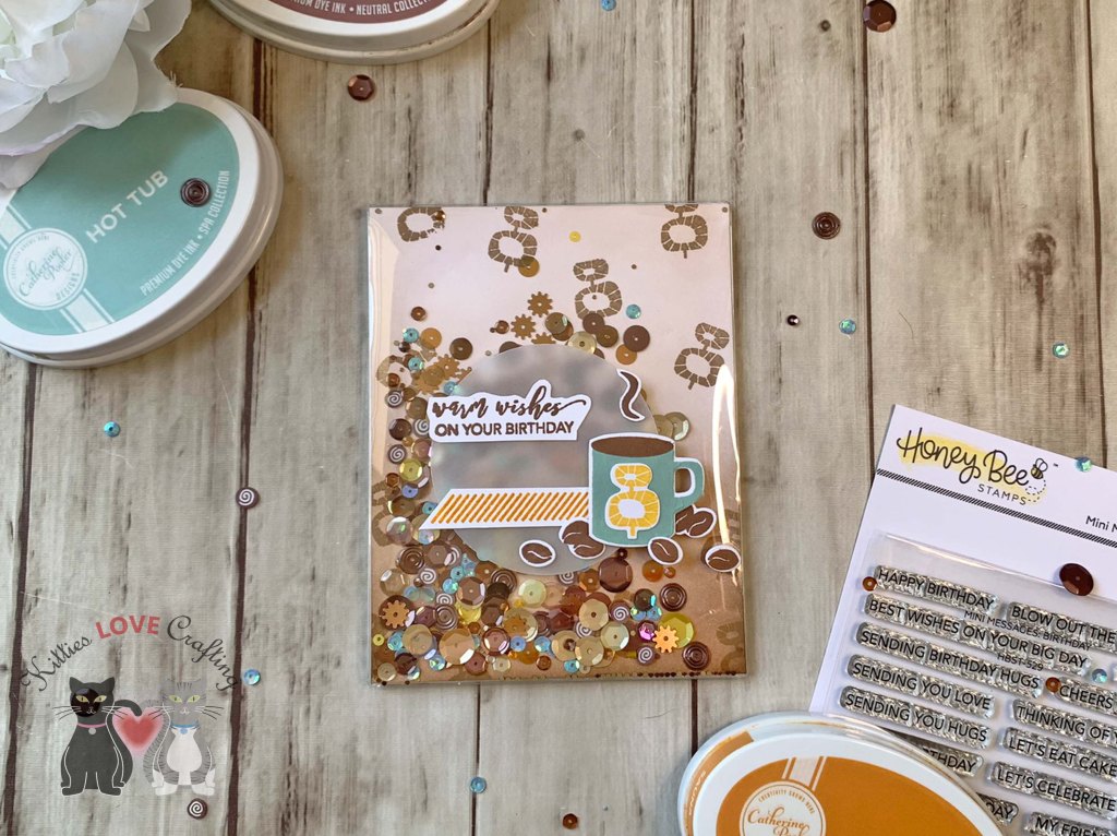 I adhered the panel to one of the Trinity Stamps A-2 Card Flat Acetate Shaker Pouches. You must adhere three sides first, add your sequins then seal the fourth side. I used Honey Bee Stamps Freshly Brewed Sequin Mix, as well as some aqua and yellow ones from my stash.