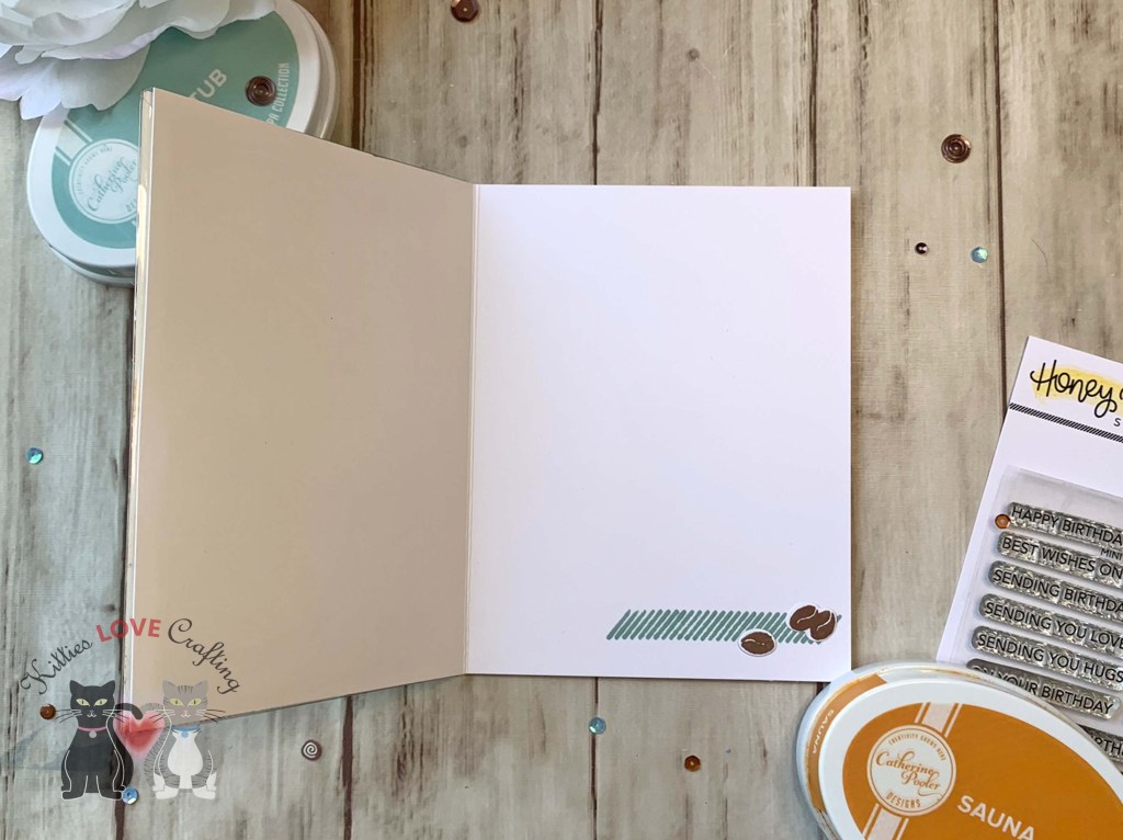 I left the inside of the card blank and added the same diagonal stripe piece from Catherine Pooler Designs For Everything Stampset (discontinued) which I stamped with Catherine Pooler Designs Hot Tub Ink. I also added some beans.