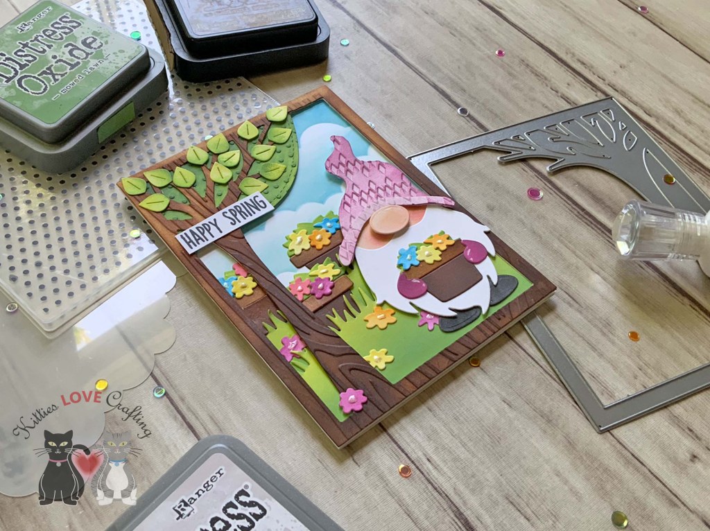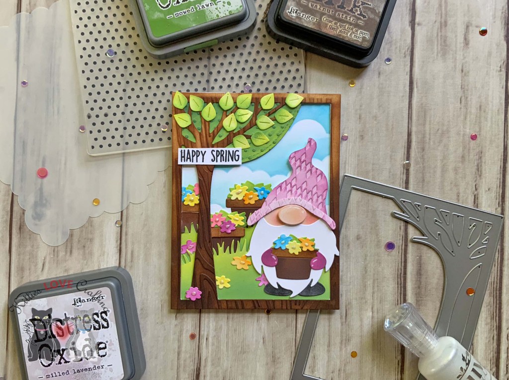 Hello friends. I couldn’t pass up the opportunity to make another card with this gnome die set from Trinity Stamps, Springtime Gnome! I’m thinking Christmas gnomes or maybe turn him into a witchy gnome!!! Stay tuned and find out.