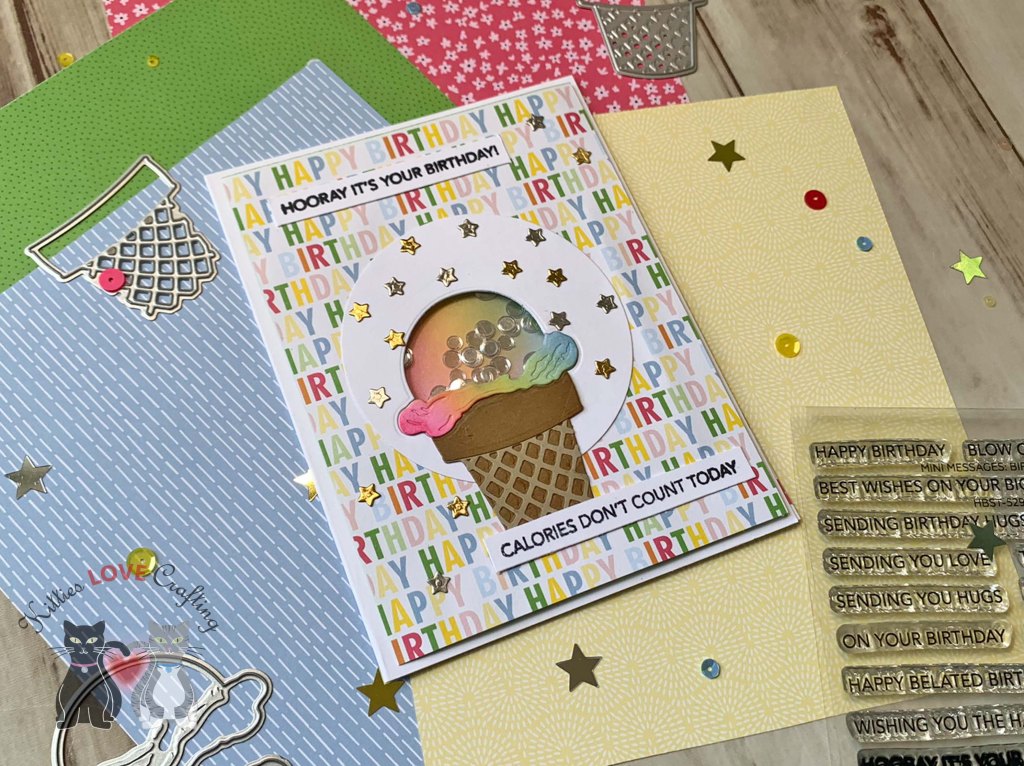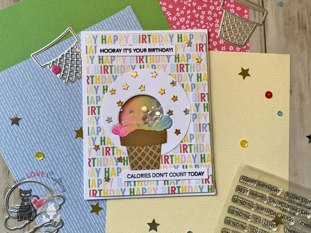 Hello friends. Here’s another quick and easy birthday card using the Lovely Layers: Cupcakes & More die set from Honeybee Stamps. For this one I created a shaker card using the ice cream dies.