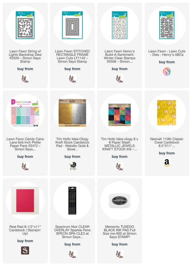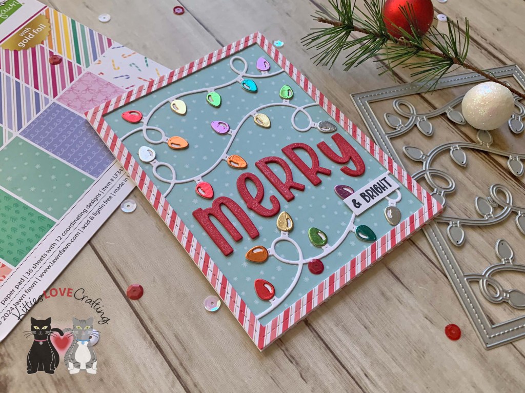 Hello friends. Need a quick card for the holidays?!? The Lawn Fawn String of Lights Backdrop Die makes that very easy! Actually this die could be used for other occasions – Halloween, Valentine’s Day cards… So many combinations are available with this die set. Stay tuned for future blog posts showing how I use pieces of this die on other cards.