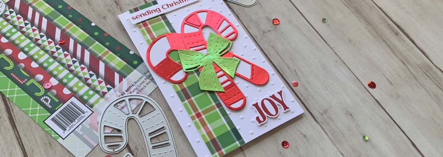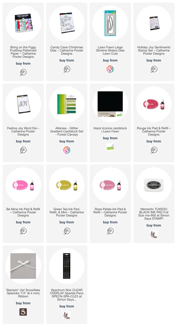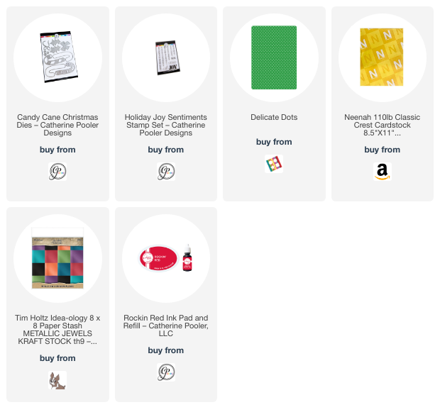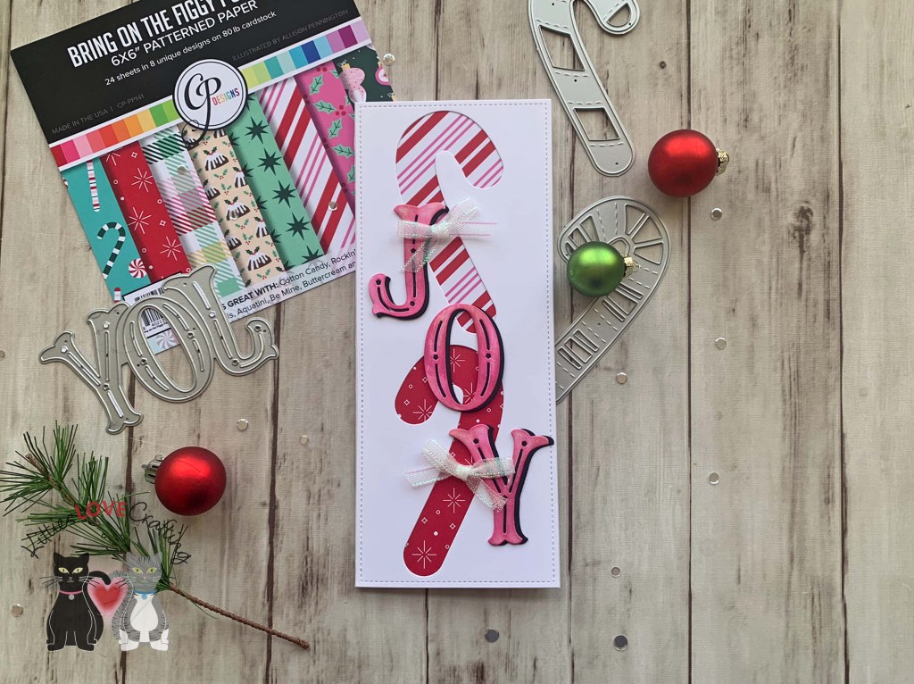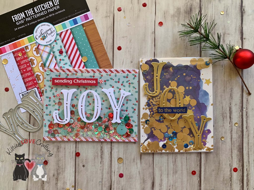 Hello friends. Here’s a fun way to use the same dies to get two different looks. My cards feature the Catherine Pooler Designs Candy Cane Christmas and Festive Joy Word Dies. One card uses the Candy Cane Christmas dies as a background for a large dimensional sentiment and the other uses the same dies as the focal image which are shakers.