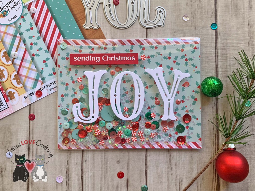Hello friends. Want to make some fun interactive holidays cards that won’t cost you extra postage?!? Try making flat shaker cards. These cards, using the Trinity Stamps A-2 Card Flat Acetate Shaker Pouches and Catherine Pooler Designs Festive Joy Word Die were quick to make. The watercolor background takes a little longer due to drying time but doesn’t add much extra time to the process and it elevates the card with little effort.