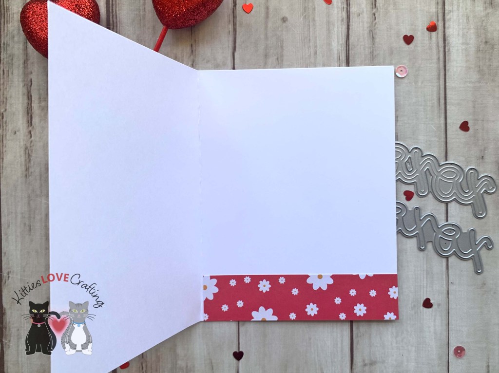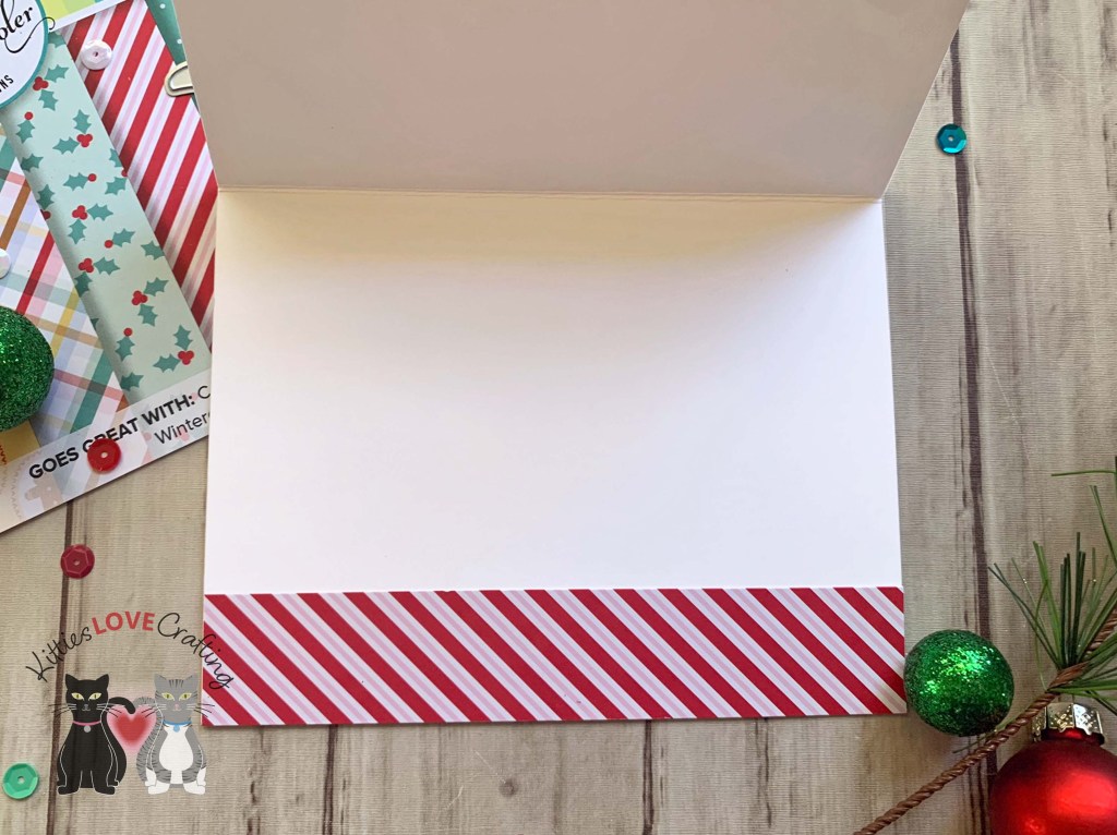 On the inside of the card, I cut a piece of the same pattern papers used on the front to 1 x 5-1/2″ and 1-1/4 x 5-1/2″. Then stamped a sentiment from my stash with Catherine Pooler Designs Rockin’ Red Ink.