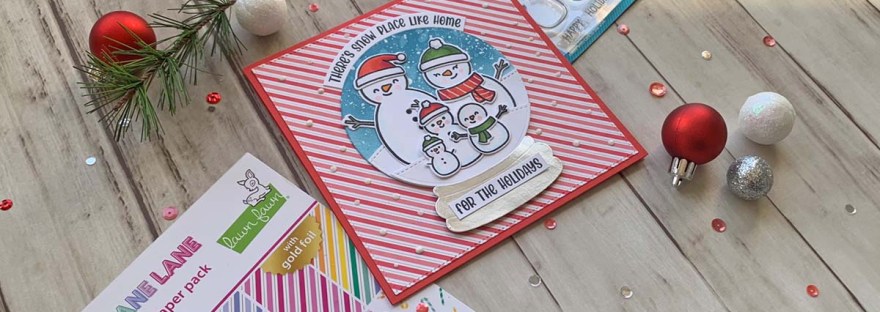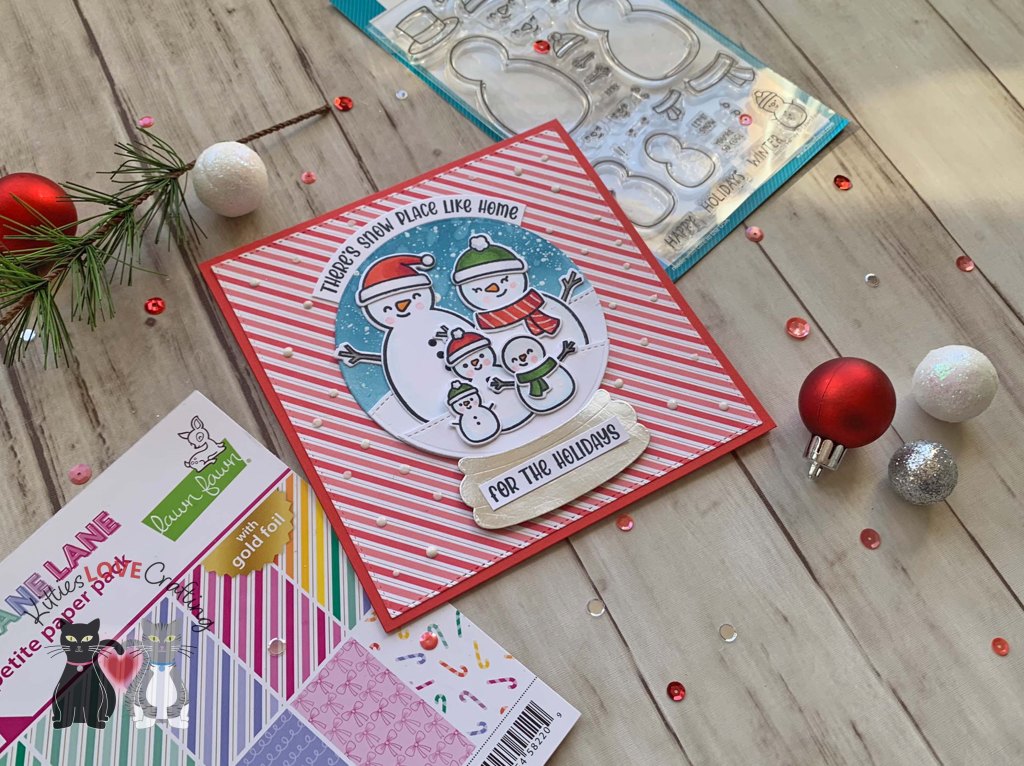 Hello friends. This cute little snowman family from Lawn Fawn Frosty Family Stamps was just so much fun to color and use on a card. I used the Catherine Pooler Snowglobe Dies (discontinued) to create this cute snowglobe scene.