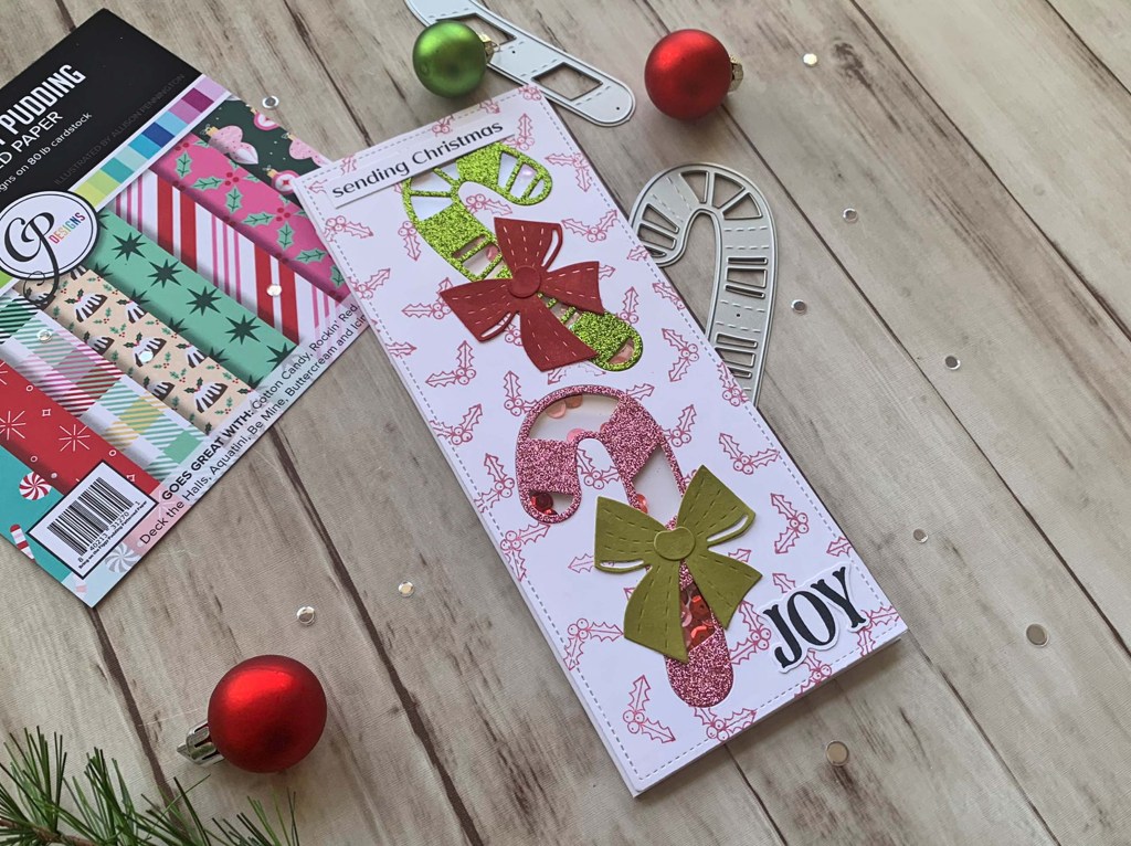 I die cut the candy canes from the back panel using the base candy cane dies from the Catherine Pooler Designs Candy Cane Christmas Dies. Then added pattern paper behind them from CP Bring on the Figgy Pudding Patterned Paper and Under the Tree Slimline Patterned Paper (discontinued).