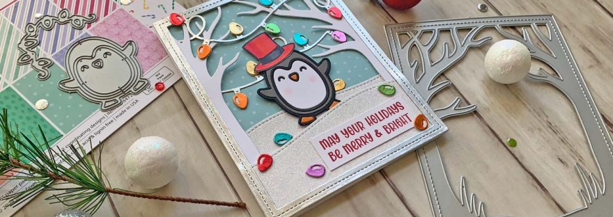 Hello friends. This cute scene card was created using some older Lawn Fawn dies with their new holiday collection. I used the Lawn Fawn Spooky Forest Backdrop die which came out for Halloween as the forest on this card. I combined it with the new Peppy Penguin and String of Lights Backdrop dies to create this cute scene.