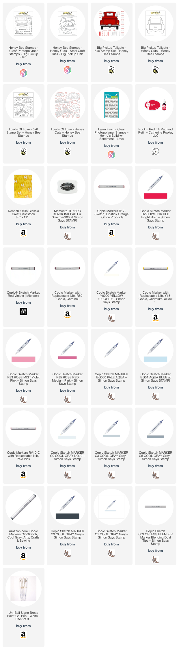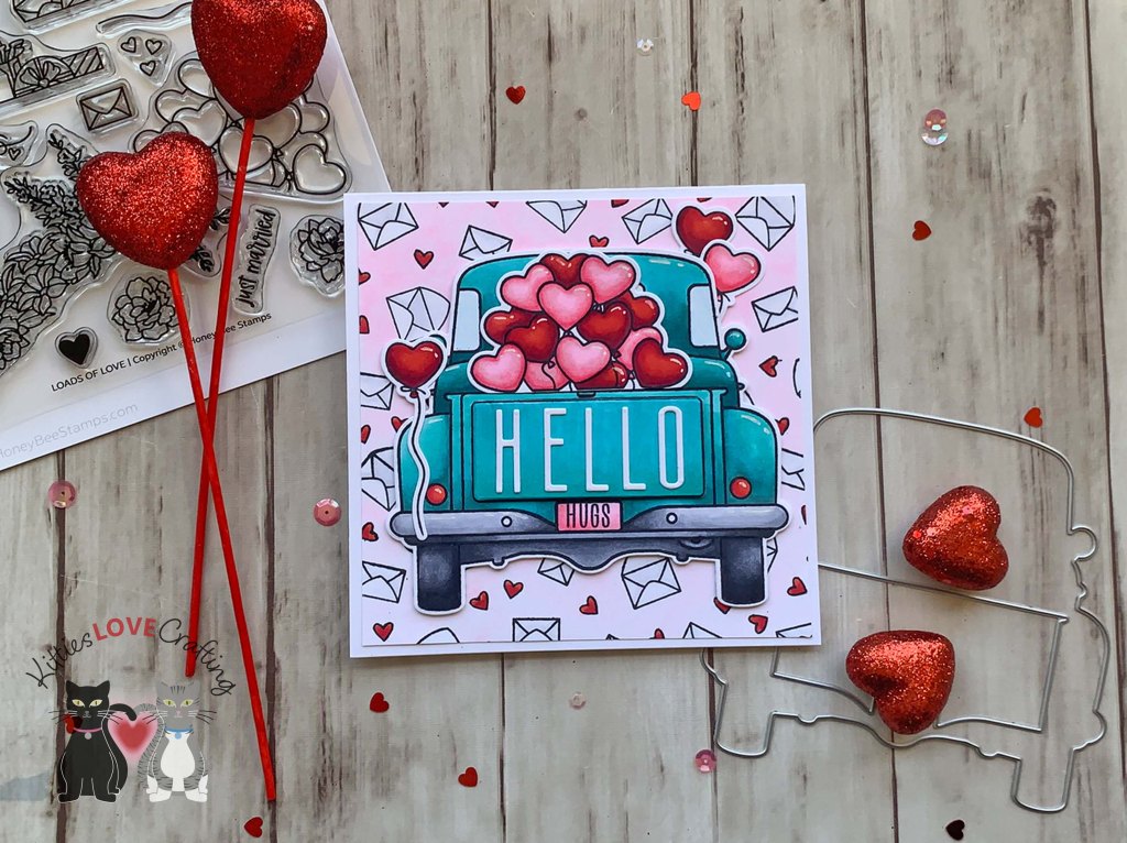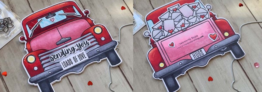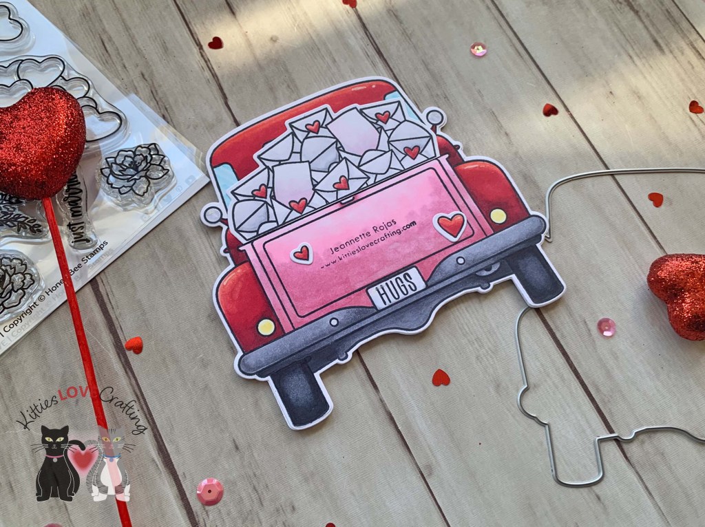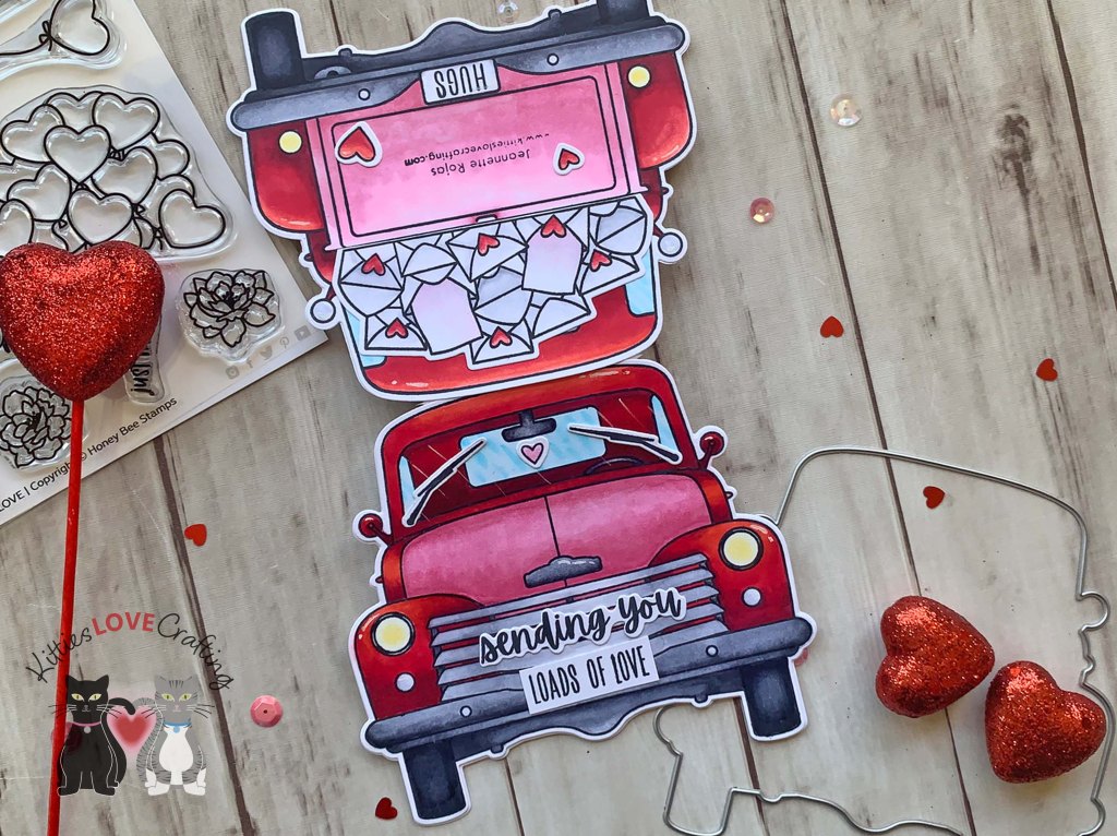 Hello friends. For this card, I decided to create a shaped card with the Honey Bee Stamps Big Pickup Cab, Big Pickup Tailgate, and Loads of Love 6×6 Stamp Sets. This card was a little time-consuming because of all the coloring but I think worth it in the end! I love how this turned out!!!