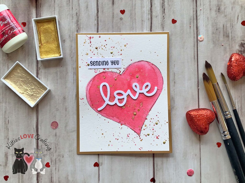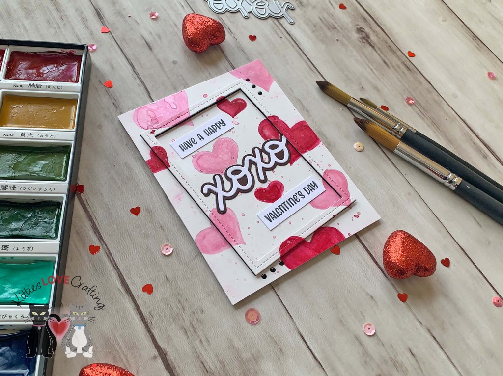 I used a large heart die to trace the heart onto my paper. I used my Kuretake Gansai Tambi Watercolor Paint Set for this card. I added splatters with the same colors as well as some gold splatters using the Zig Kuretake Gansai Tambi STARRY COLORS. Once dried, I erased any left over pencil marks and sketched lines around the hearts.