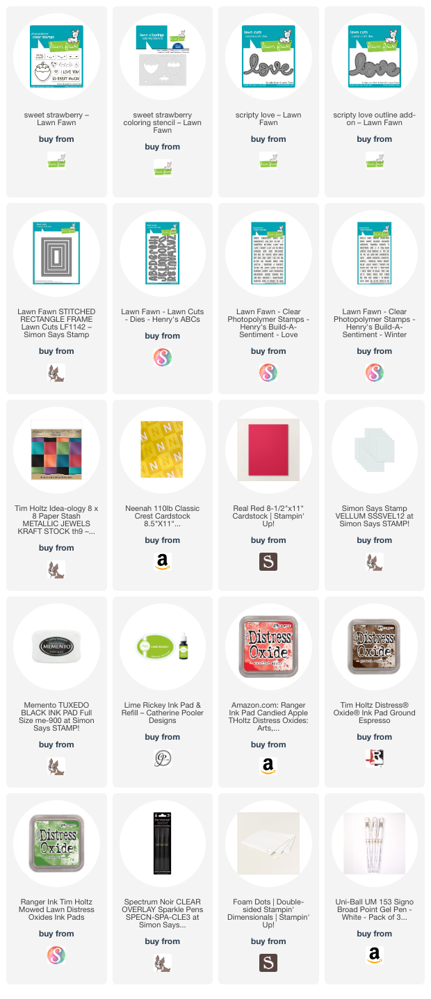 Hello friends. I’m starting my Valentine’s Day card series with a cute but simple card using new Lawn Fawn Sweet Strawberry stamp and coordinating stencil. The stencil made building my background so much faster than coloring with markers. I love my Copic markers but sometimes it’s nice not to have to color.