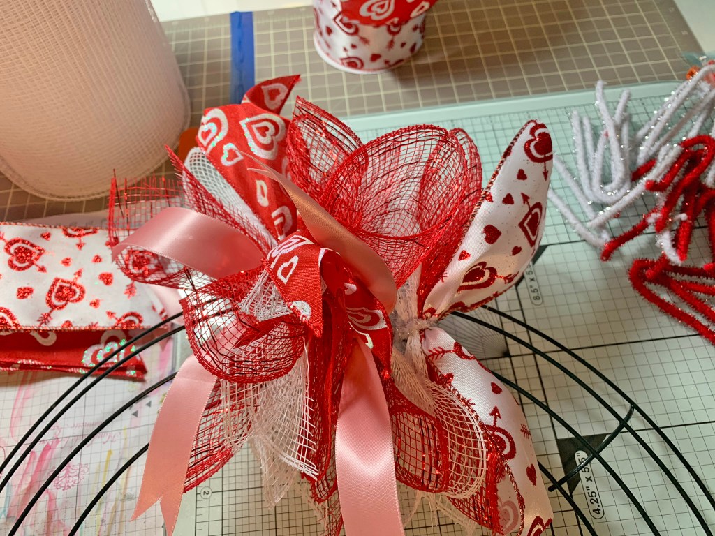 - Ribbon – 2.5 inch wide White Wire Ribbon with red glitter hearts, Red Wire Ribbon, 2.5 inch wide with white glitter hearts, and 1 1/4 inch pink (Michaels)