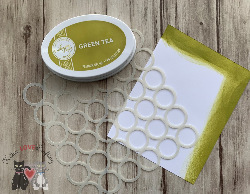 I started by cutting down a piece of Neenah Solar White 110lb Cardstock to 4 x 5-1/4″. Then created a pattern in the background using Catherine Pooler Designs Rose Petals and Catherine Pooler Designs Pattern of Rings Creative Screening.