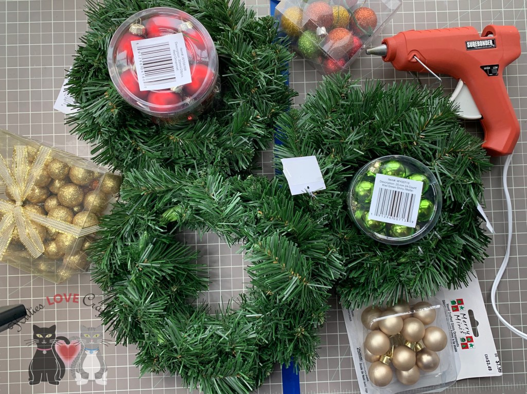 These were super easy to make and inexpensive. The supplies I used are mini wreaths, 25-30mm Ornaments, 5/8” Red Satin Ribbon, Hot Glue Gun and Gorilla Glue Hot Glue Sticks. These little wreaths would make great gifts as well or can be used around a candle for a festive centerpiece.