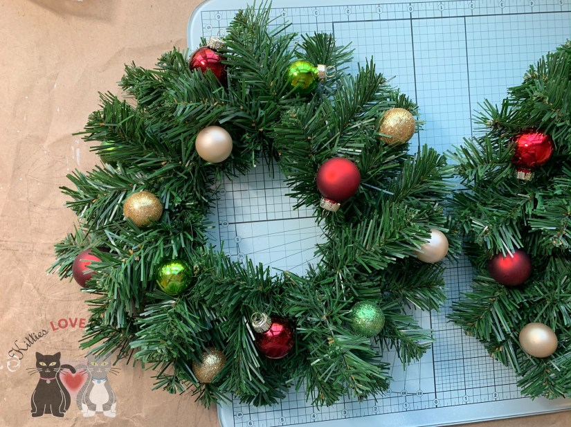 I bought three mini wreaths from Target and hot glued red, green, and gold ornaments to it, scattering them around the wreath. The pale gold, glitter gold, and red and green glitter ornaments are ones I used from my stash.