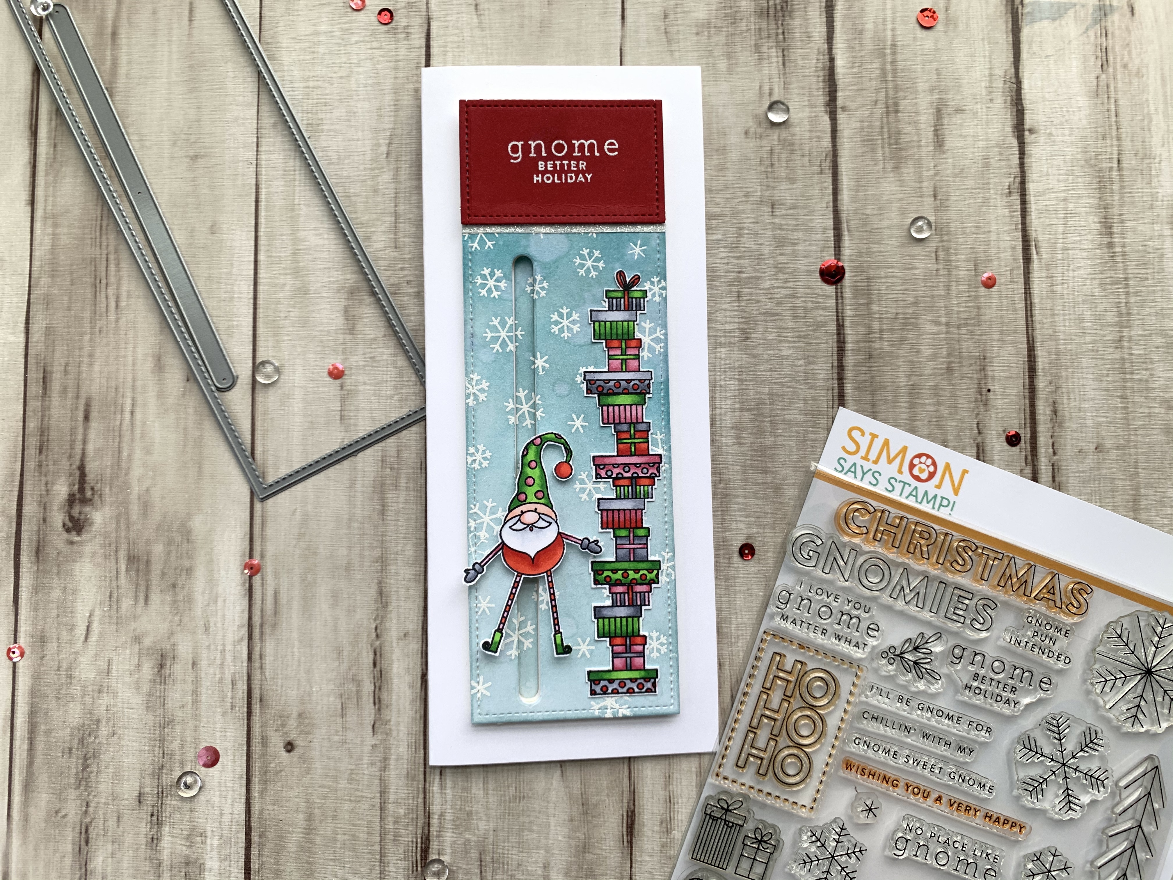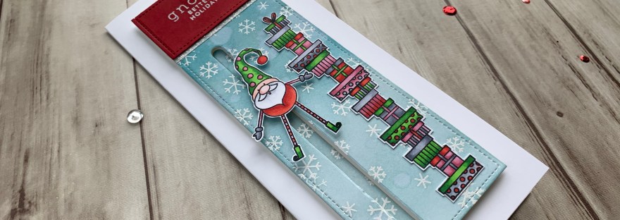 Happy Wednesday friends! I thought I would revisit an old Simon Says Stamp Card Kit. The ‘Gnome for the Holidays’ Card Kit was released in December 2019 and features the cute 6 x 8″ Gnome for the Holidays stampset. I thought it might be fun to make a slimline slider card with the little gnomes. It was fairly easy to make and can be even more simplified by skipping th eheat embossing and doing simple coloring on the images.