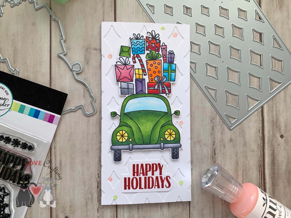 Hello friends. This festive holiday card features several of the Scrappy Tails Crafts add-on dies for the Slimline Bird House Pop Up Card Metal Die. These are tons of fun to play with and quickly becoming another favorite house builder set. These standalone dies are especially great for those of you who dislike or struggle with stamping.