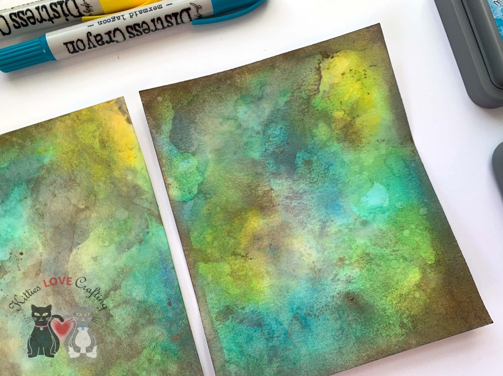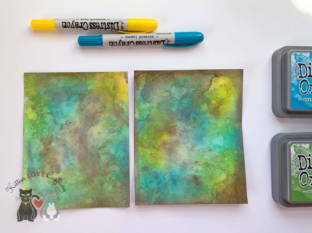 I then used Salty Ocean, Blueprint Sketch, Mustard Seed, and Vintage Photo Distress Crayons and smeared them with my finger (Tip: Wet your finger a little to smooth). I reinked the panels with Mermaid Lagoon and Mowed Lawn Distress Oxide Inks to brighten them up a bit. Then, added more salt and water to see if it would react again.