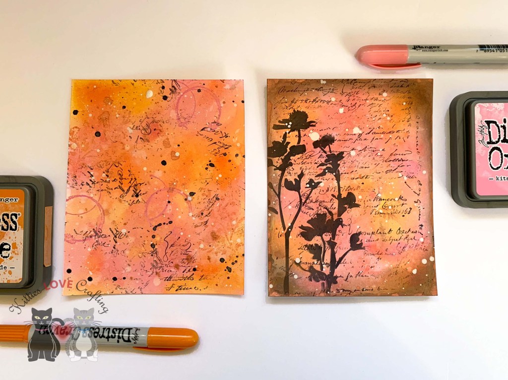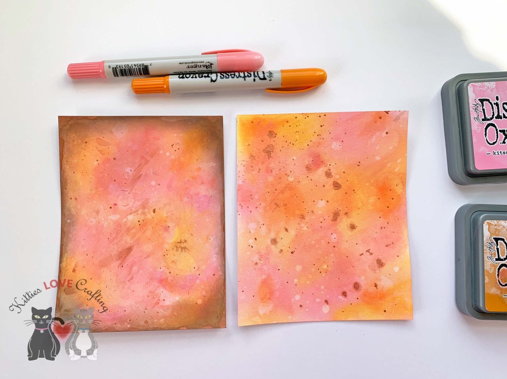 For the first set of backgrounds, I started the process by ink blending on both the Cold Press Watercolor Paper and Strathmore Bristol Smooth Multimedia Paper. I used Kitsch Flamingo, Worn Lipstick, Wild Honey, Spiced Marmalade, and Walnut Stain Distress Oxide Inks. I sprayed water onto both panels with the Tim Holtz Distress Sprayer, let it sit for a few minutes and pat dry with a paper towel.