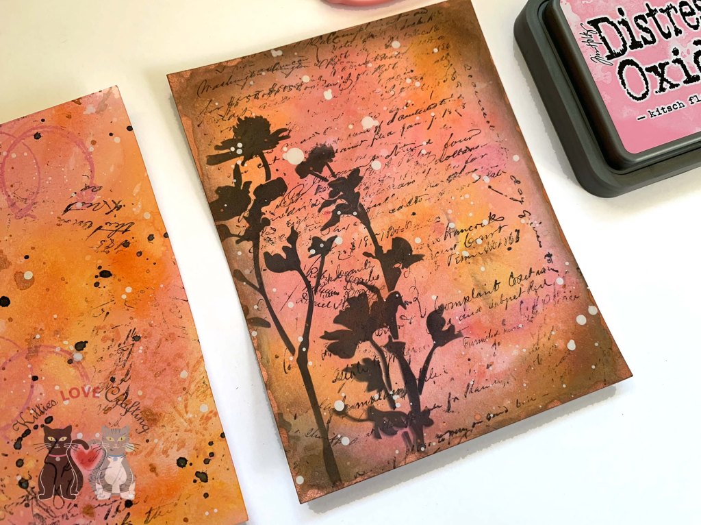 Once all dry, I used the Stampers Anonymous – Tim Holtz – Ledger Script Stamp with Ranger Archival JET BLACK Ink to both panels. I used the Stampin’ Up! Timeless Textures Rubber Stampset (retired) with Spiced Marmalade and Picked Raspberry Distress Oxide Inks on the watercolor paper panel and stamped using the Tim Holtzยฎ Stampers Anonymous Wildflower Layering Stencils (THS035) with Ranger Archival JET BLACK Ink on the Strathmore Bristol Smooth Paper panel.