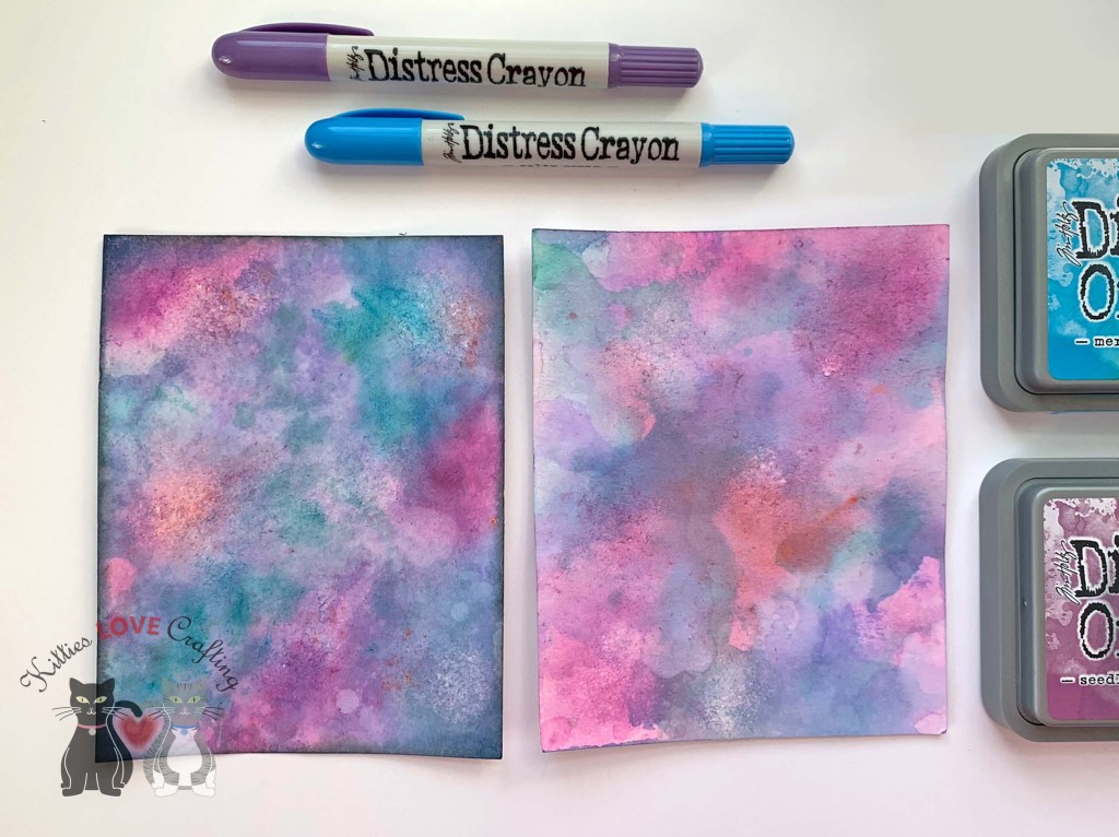 Observations: I didn’t see much of a reaction to the salt on either papers. Not sure if I didn’t leave it on a sufficient amount of time or if only the regular distress inks react to the salt. Again, the distress crayons are much harder to move and blend out on the watercolor paper and the colors are more vibrant on the watercolor paper.