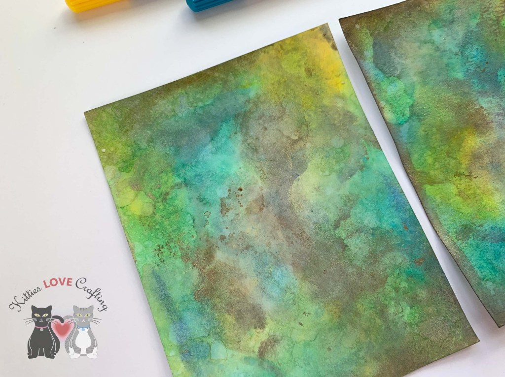 For the second set of backgrounds, I started the process by ink blending on both the Cold Press Watercolor Paper and Strathmore Bristol Smooth Multimedia Paper. I used Scattered Straw, Mermaid Lagoon, Mowed Lawn and Walnut Stain Distress Oxide Inks. I sprayed water onto both panels with the Tim Holtz Distress Sprayer and sprinkled Coarse Salt, let it sit for a few minutes and pat dry with a paper towel and rubbed off the salt. Be very gentle with this because you can tear you paper if it’s still wet.