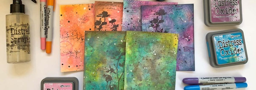 Hello friends. I had some fun playing with my distress inks and other products and created several backgrounds. Sometimes itโs nice just to play with mediums and not think too much. I love distress inks because they create cool effects when water or other mediums are combined with them. I ended up with 6 backgrounds I will later turn into cards. Stay tuned for that postโฆ