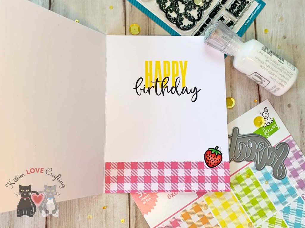 On the inside of the card, I stamped a sentiment from Stampin’ Up’s Biggest Wish Stampset with Catherine Pooler Limoncello Ink and Memento Tuxedo Ink. I adhered a piece of the pink gingham paper (featured on the front of the card), measuring 1 x 4-1/4″ as well as a strawberry.