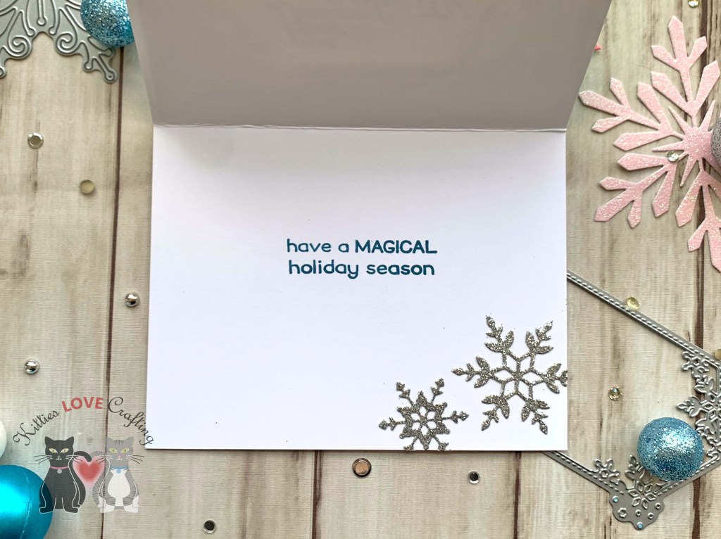 On the inside of the card, I stamped a sentiment from Lawn Fawn’s Merry Messages Stamp Set with Catherine Pooler Designs Black Jack Ink and added a Balmy Blue Glitter snowflake .