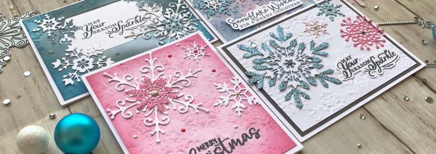I die cut snowflakes from Neenah 110lb Classic Crest Cardstock 8.5 X 11″ as well as some bright pink glitter paper from my stash. I used the Catherine Pooler Designs Delicate Snowflake Die (discontinued), Stampin’ Up! So Many Snowflakes (retired) and Stampin’ Up! Colorful Seasons.