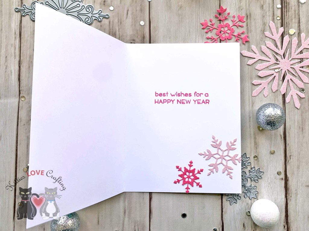 On the inside of the card, I stamped a sentiment from Lawn Fawn’s Merry Messages Stamp Set Tim Holtz Picked Raspberry Distress Oxide Ink and added bright pink snowflakes.