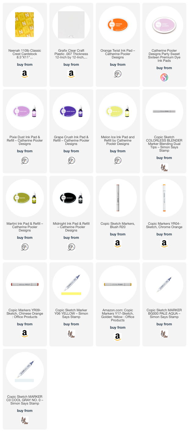 I stamped the images from Catherine Pooler Designs Fright Night Stampset (included in the Boo Box) using CP Midnight, Cotton Candy, Orange Twist, Melon Ice, and Pixie Dust Inks. I used Copic Markers to give the ghosts some dimension as well as the jar, candy corn and poison bottles. I used C0, R20 & 0 for the ghosts; BG000 & 0 for the bottles and jar; and C0 & 0, Y06 & Y17, and YR04 & YR09 for the candy corn.