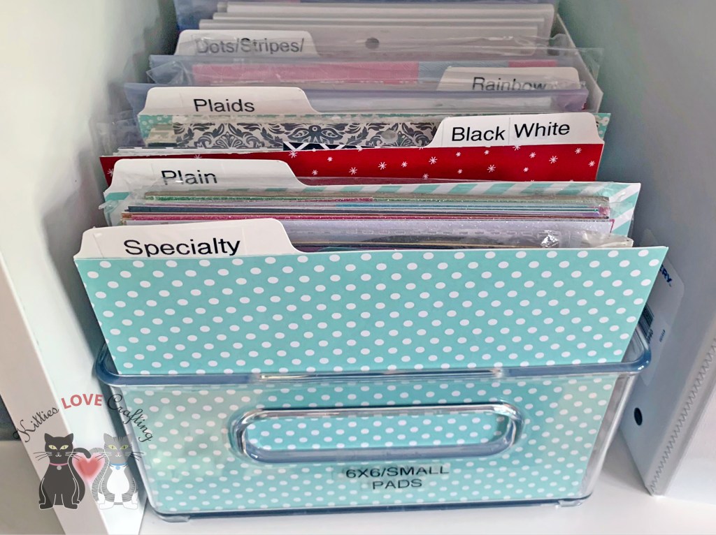 2. Organization. Another great use for pattern paper is for organization. I used pattern papers to make dividers for my 6 x 6 paper pads. I keep mine in clear fridge bins; this one measures 8W x 14.5L x 4โH and I got this it from Amazon. I created these using old white 3 ring binder dividers I had purchased ions ago and then adding the pattern paper to the front of it. I cut the white dividers to 6-1/2โw x 7โh and the paper to 6โw x 7โh. Glue them together, add a label and you have cute dividers.